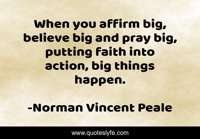 This page presents the quote "When you affirm big, believe big and pray big, putting faith into action, big things happen.". Author of this quote is Norman Vincent Peale. This quote is about lifetime-version, motivate, inspire, action-handbook, motivational-inspirational, inspirational-living, motivational, motivational-living, motivation,.