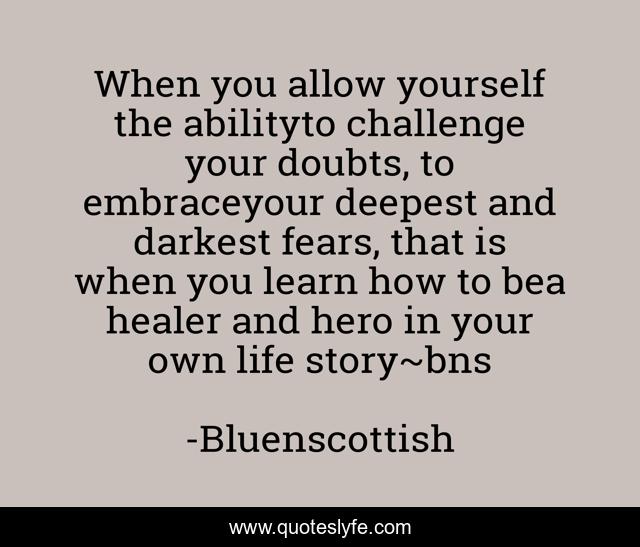 This page presents the quote "When you allow yourself the abilityto challenge your doubts, to embraceyour deepest and darkest fears, that is when you learn how to bea healer and hero in your own life story~bns". Author of this quote is Bluenscottish. This quote is about challenge, leadership, success-self-improvement,.