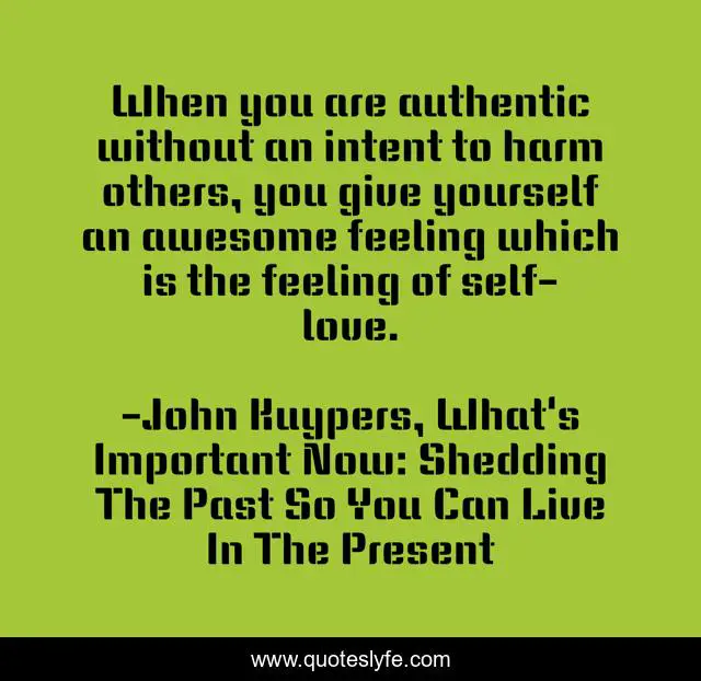 This page presents the quote "When you are authentic without an intent to harm others, you give yourself an awesome feeling which is the feeling of self-love.". Author of this quote is John Kuypers, What's Important Now: Shedding The Past So You Can Live In The Present. This quote is about present-moment, self-improvement, inspirational, enthusiasm, authentic, happiness,.