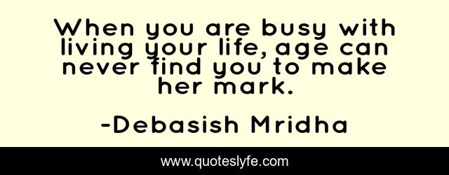 This page presents the quote "When you are busy with living your life, age can never find you to make her mark.". Author of this quote is Debasish Mridha. This quote is about inspirational, age, philosophy, debasish-mridha, young-and-old, living-you-life, quotes, debasish-mridha-md, feeling-young,.