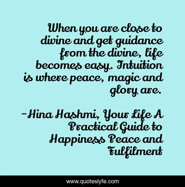 This page presents the quote "When you are close to divine and get guidance from the divine, life becomes easy. Intuition is where peace, magic and glory are.". Author of this quote is Hina Hashmi, Your Life A Practical Guide to Happiness Peace and Fulfilment. This quote is about intuition, peace, life, peace-of-mind, life-philosophy, divine,.