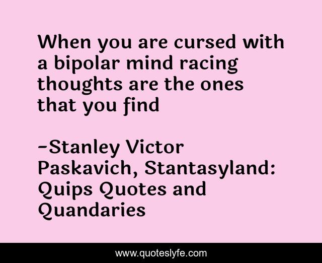 This page presents the quote "When you are cursed with a bipolar mind racing thoughts are the ones that you find". Author of this quote is Stanley Victor Paskavich, Stantasyland: Quips Quotes and Quandaries. This quote is about bipolar, cacing-thoughts, mental-illness, thoughts, bipolar-disorder,.