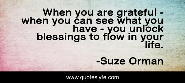 This page presents the quote "When you are grateful - when you can see what you have - you unlock blessings to flow in your life.". Author of this quote is Suze Orman. This quote is about life, blessings, grateful,.