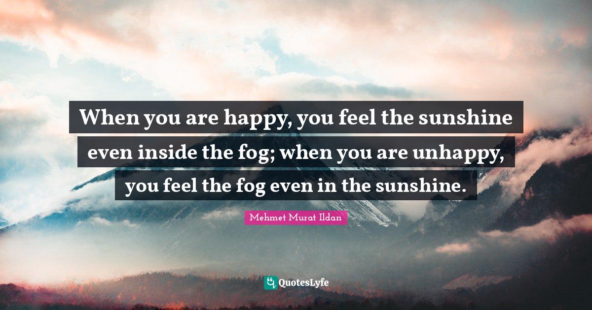 This page presents the quote "When you are happy, you feel the sunshine even inside the fog; when you are unhappy, you feel the fog even in the sunshine.". Author of this quote is Mehmet Murat Ildan. This quote is about sunshine, fog, happy, unhappy,.