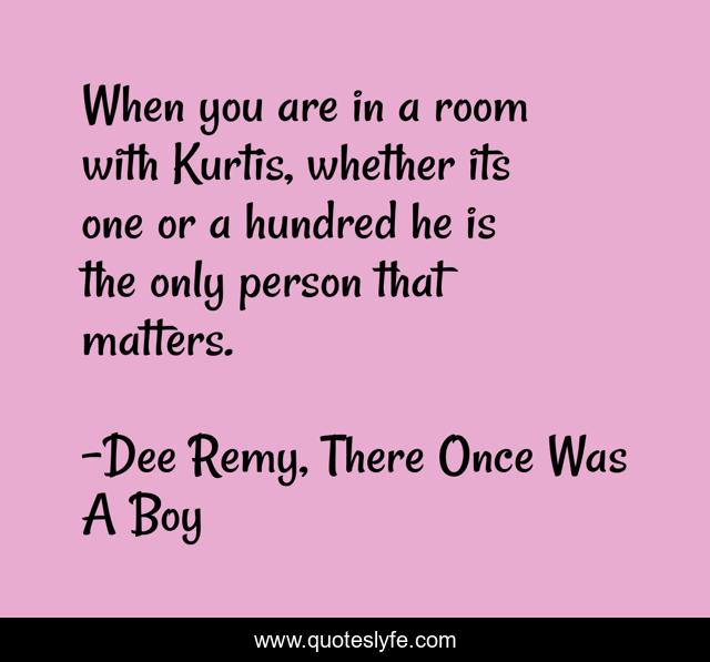 This page presents the quote "When you are in a room with Kurtis, whether its one or a hundred he is the only person that matters.". Author of this quote is Dee Remy, There Once Was A Boy. This quote is about romance, inspirational, enthusiasm, paranormal-romance, happiness, vanity,.