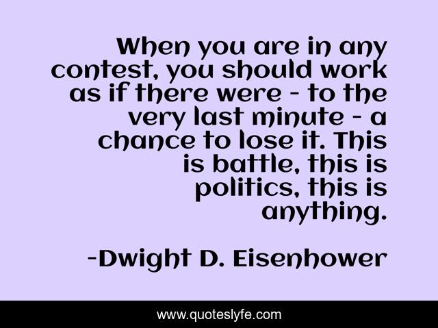 This page presents the quote "When you are in any contest, you should work as if there were - to the very last minute - a chance to lose it. This is battle, this is politics, this is anything.". Author of this quote is Dwight D. Eisenhower. This quote is about battle, politics, work,.