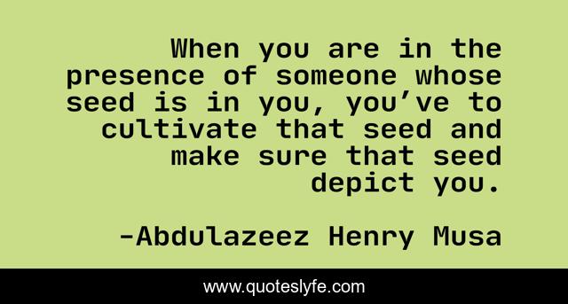 This page presents the quote "When you are in the presence of someone whose seed is in you, you’ve to cultivate that seed and make sure that seed depict you.". Author of this quote is Abdulazeez Henry Musa. .