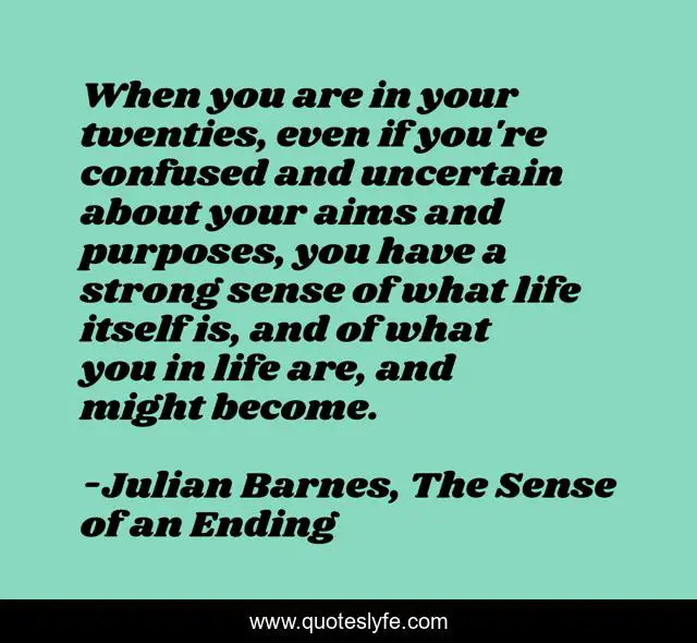 This page presents the quote "When you are in your twenties, even if you're confused and uncertain about your aims and purposes, you have a strong sense of what life itself is, and of what you in life are, and might become.". Author of this quote is Julian Barnes, The Sense of an Ending. This quote is about youth, life-philosophy, twenties,.