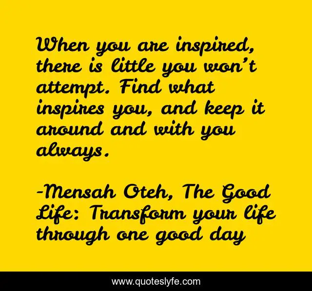 "Mensah Oteh, The Good Life: Transform your life through one good day Quotes." Quoteslyfe.com, 2025. Sat. 06 Dec. 2025. <https://www.quoteslyfe.com/quote/When-you-are-inspired-there-is-little-49054>.