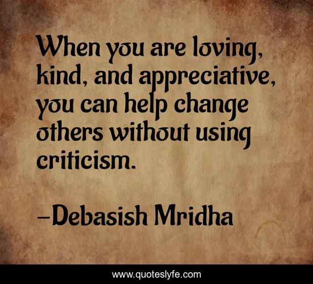 This page presents the quote "When you are loving, kind, and appreciative, you can help change others without using criticism.". Author of this quote is Debasish Mridha. This quote is about criticism, kind, how-to-help-others, appreciative, philosophy, debasish-mridha, quotes, debasish-mridha-md, inspirational,.