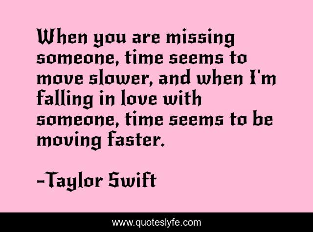 This page presents the quote "When you are missing someone, time seems to move slower, and when I'm falling in love with someone, time seems to be moving faster.". Author of this quote is Taylor Swift. This quote is about love, moving, affection,.