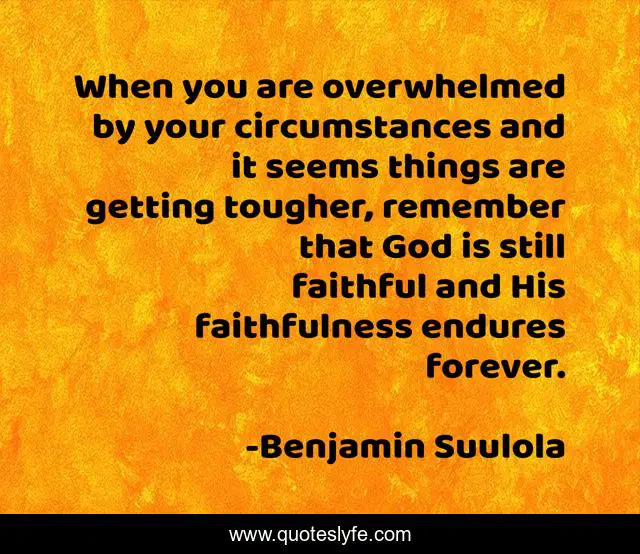 This page presents the quote "When you are overwhelmed by your circumstances and it seems things are getting tougher, remember that God is still faithful and His faithfulness endures forever.". Author of this quote is Benjamin Suulola. This quote is about faithfulness, destiny, live-your-best-life, ability-and-attitude, courage, purpose, faithful,.