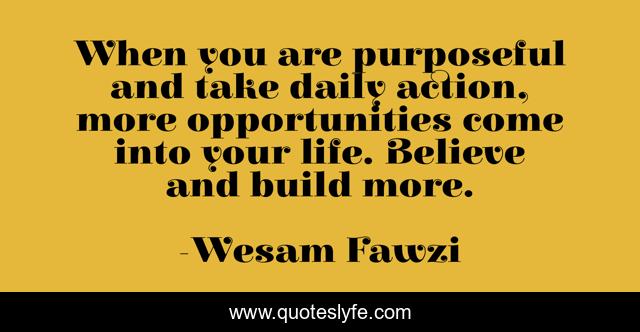 This page presents the quote "When you are purposeful and take daily action, more opportunities come into your life. Believe and build more.". Author of this quote is Wesam Fawzi. This quote is about believe-in-yourself, actions-speak-louder-than-words, building-your-dream, opportunities-in-life, purpose-driven-life,.