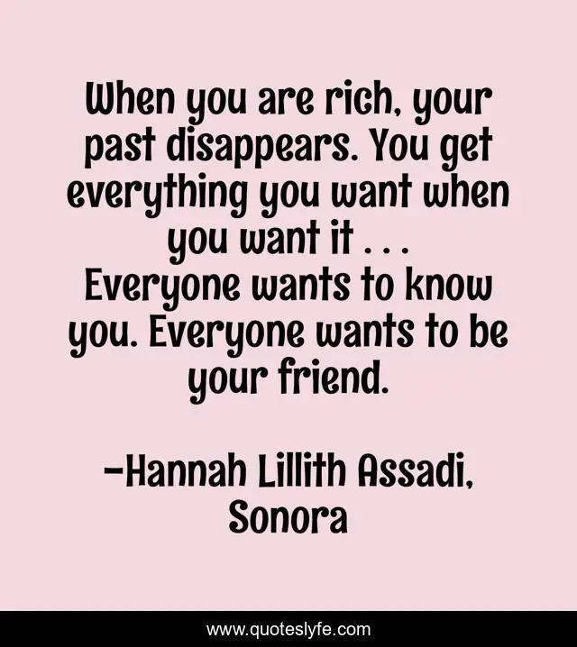 This page presents the quote "When you are rich, your past disappears. You get everything you want when you want it . . . Everyone wants to know you. Everyone wants to be your friend.". Author of this quote is Hannah Lillith Assadi, Sonora. This quote is about instant-gratification, popularity, hannah-lillith-assadi, past, rich, wealthy, sonora,.