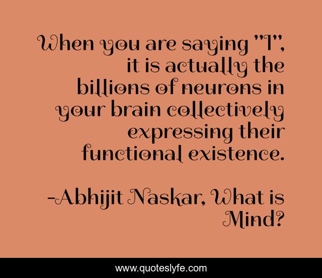 This page presents the quote "When you are saying "I", it is actually the billions of neurons in your brain collectively expressing their functional existence.". Author of this quote is Abhijit Naskar, What is Mind?. This quote is about i-am, brainy, self-awareness, self, mind, wisdom, science-of-mind,.
