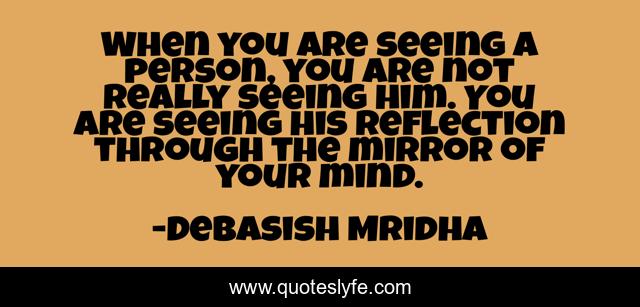 This page presents the quote "When you are seeing a person, you are not really seeing him. You are seeing his reflection through the mirror of your mind.". Author of this quote is Debasish Mridha. This quote is about seeing-a-person, philosophy, debasish-mridha, quotes, inspirational, how-do-you-really-know-someone, enthusiasm, mirror-of-your-mind, debasish-mridha-m-d,.