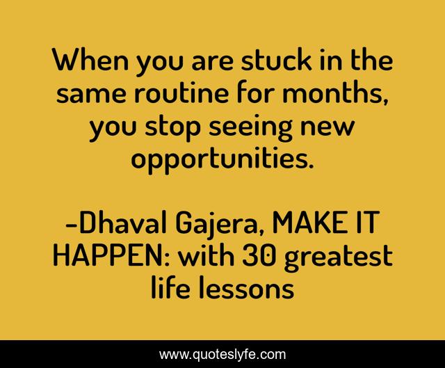 This page presents the quote "When you are stuck in the same routine for months, you stop seeing new opportunities.". Author of this quote is Dhaval Gajera, MAKE IT HAPPEN: with 30 greatest life lessons. This quote is about stuck, opportunities, routine,.