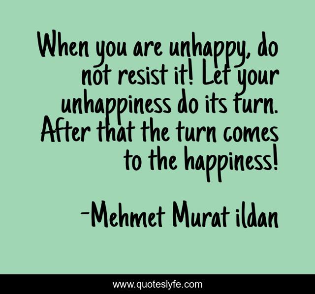 This page presents the quote "When you are unhappy, do not resist it! Let your unhappiness do its turn. After that the turn comes to the happiness!". Author of this quote is Mehmet Murat ildan. This quote is about murat-ildan, unhappy, resist, turn, your-turn, turkish-literature, unhappiness,.