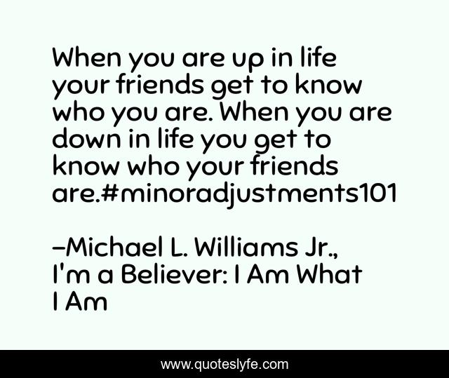 This page presents the quote "When you are up in life your friends get to know who you are. When you are down in life you get to know who your friends are.#minoradjustments101". Author of this quote is Michael L. Williams Jr., I'm a Believer: I Am What I Am. This quote is about author, prison, pastor, quotes, church, instructor, hope, motivational-speaker,.