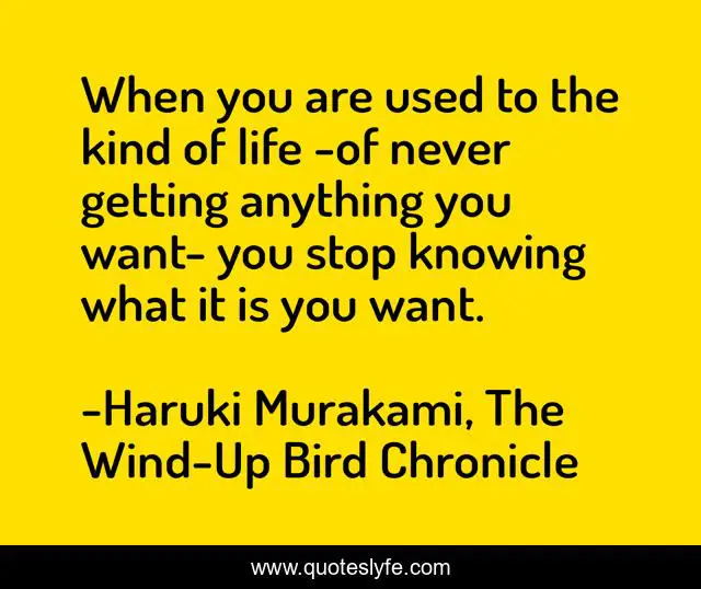 This page presents the quote "When you are used to the kind of life -of never getting anything you want- you stop knowing what it is you want.". Author of this quote is Haruki Murakami, The Wind-Up Bird Chronicle. This quote is about enthusiasm, inspirational,.