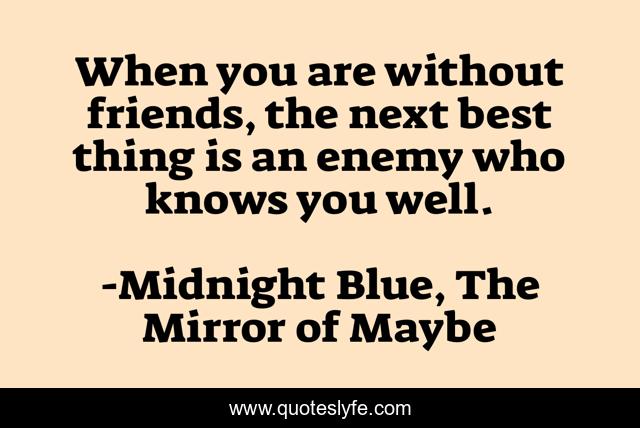 This page presents the quote "When you are without friends, the next best thing is an enemy who knows you well.". Author of this quote is Midnight Blue, The Mirror of Maybe. This quote is about enemy, frienship, friends, enemies,.