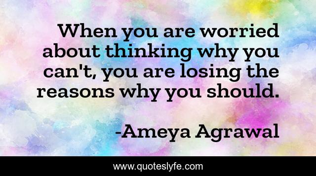 This page presents the quote "When you are worried about thinking why you can't, you are losing the reasons why you should.". Author of this quote is Ameya Agrawal. This quote is about life, life-lessons, motivation, positive-thinking, motives, worries, inspiration,.