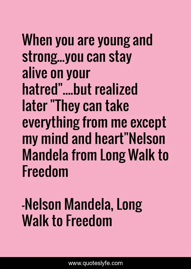 This page presents the quote "When you are young and strong...you can stay alive on your hatred"....but realized later "They can take everything from me except my mind and heart"Nelson Mandela from Long Walk to Freedom". Author of this quote is Nelson Mandela, Long Walk to Freedom. This quote is about freedom, writer, leader, mandela,.