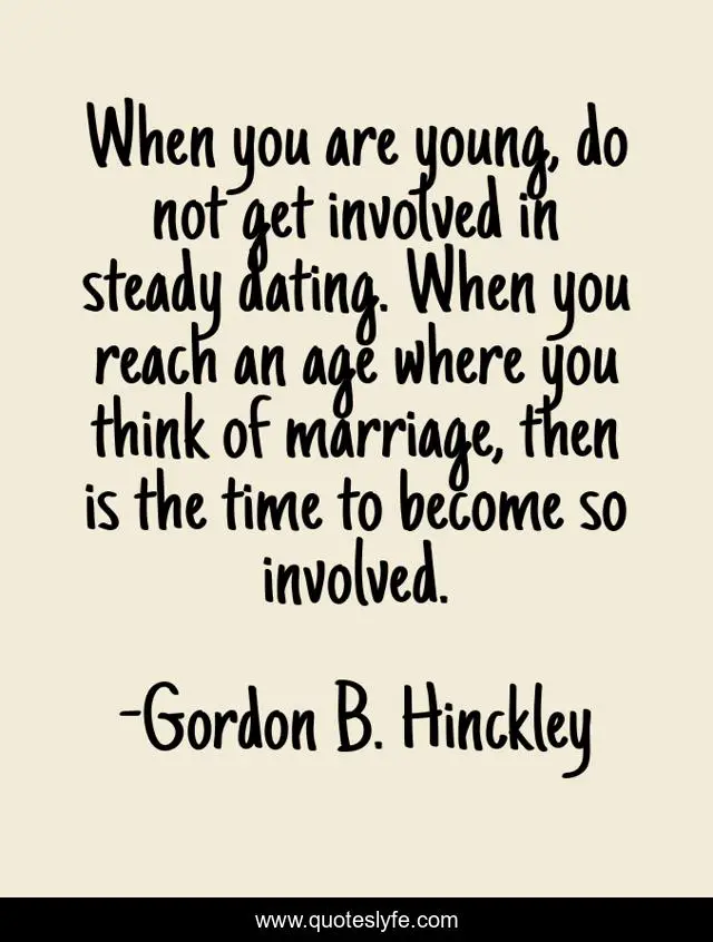 This page presents the quote "When you are young, do not get involved in steady dating. When you reach an age where you think of marriage, then is the time to become so involved.". Author of this quote is Gordon B. Hinckley. This quote is about age, dating, time,.