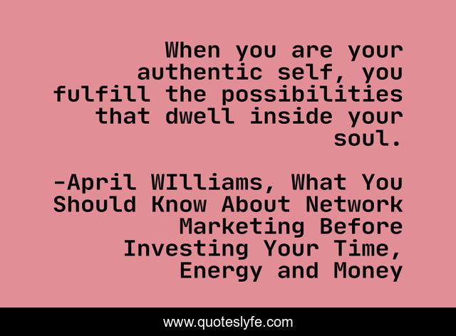 This page presents the quote "When you are your authentic self, you fulfill the possibilities that dwell inside your soul.". Author of this quote is April WIlliams, What You Should Know About Network Marketing Before Investing Your Time, Energy and Money. This quote is about branding, marketing, authenticity, personal-branding, fearless, authentic,.