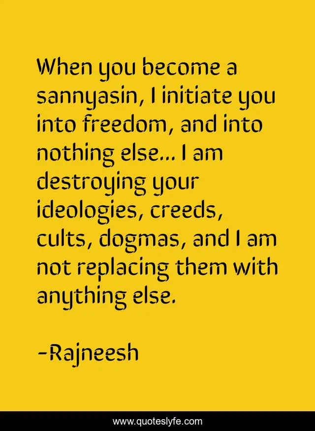 This page presents the quote "When you become a sannyasin, I initiate you into freedom, and into nothing else... I am destroying your ideologies, creeds, cults, dogmas, and I am not replacing them with anything else.". Author of this quote is Rajneesh. .