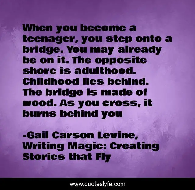 This page presents the quote "When you become a teenager, you step onto a bridge. You may already be on it. The opposite shore is adulthood. Childhood lies behind. The bridge is made of wood. As you cross, it burns behind you". Author of this quote is Gail Carson Levine, Writing Magic: Creating Stories that Fly. This quote is about bridge, adulthood, childhood,.