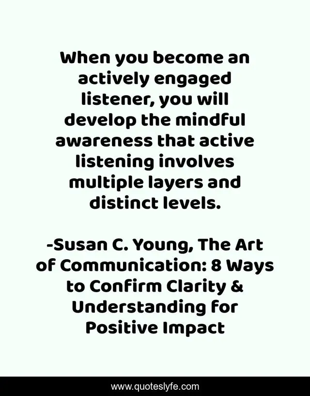 "Susan C. Young, The Art of Communication: 8 Ways to Confirm Clarity & Understanding for Positive Impact Quotes." Quoteslyfe.com, 2025. Sat. 06 Dec. 2025. <https://www.quoteslyfe.com/quote/When-you-become-an-actively-engaged-listener-233441>.