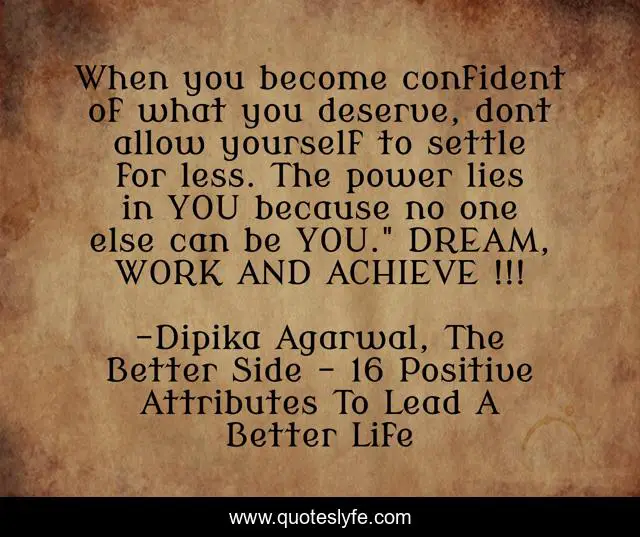 This page presents the quote "When you become confident of what you deserve, dont allow yourself to settle for less. The power lies in YOU because no one else can be YOU." DREAM, WORK AND ACHIEVE !!!". Author of this quote is Dipika Agarwal, The Better Side - 16 Positive Attributes To Lead A Better Life. .