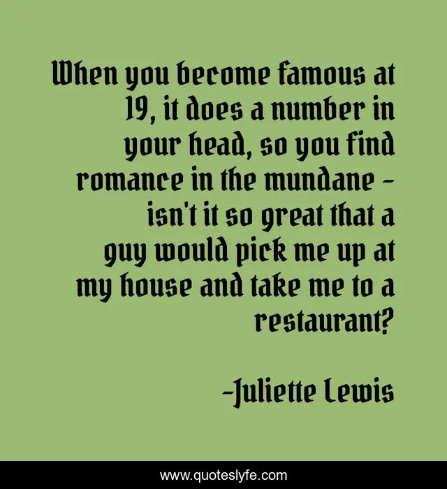 This page presents the quote "When you become famous at 19, it does a number in your head, so you find romance in the mundane - isn't it so great that a guy would pick me up at my house and take me to a restaurant?". Author of this quote is Juliette Lewis. This quote is about me, great, restaurant,.