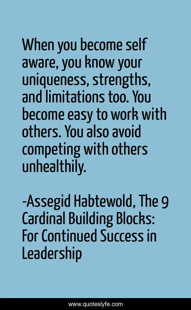 This page presents the quote "When you become self aware, you know your uniqueness, strengths, and limitations too. You become easy to work with others. You also avoid competing with others unhealthily.". Author of this quote is Assegid Habtewold, The 9 Cardinal Building Blocks: For Continued Success in Leadership. This quote is about limitations, self-awareness, easy-to-work-with, competition, uniqueness, strengths,.