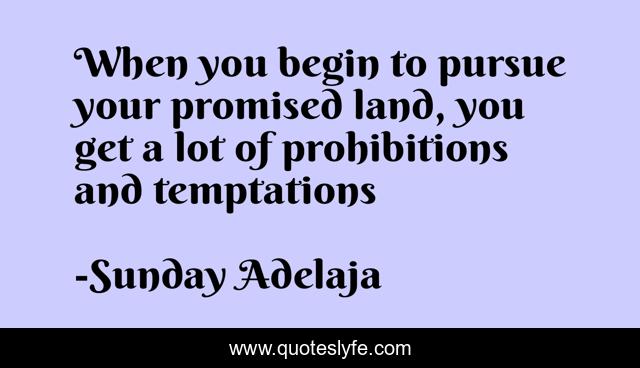 This page presents the quote "When you begin to pursue your promised land, you get a lot of prohibitions and temptations". Author of this quote is Sunday Adelaja. This quote is about discipline, life, blessing, finance, temptation, money, work, focus, overcoming-temptation,.