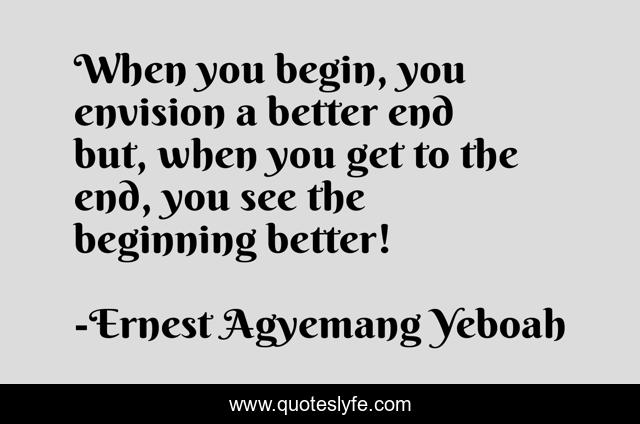 This page presents the quote "When you begin, you envision a better end but, when you get to the end, you see the beginning better!". Author of this quote is Ernest Agyemang Yeboah. This quote is about endings-and-beginnings, regrets-free-life, begin-with-the-end-in-mind, ending, beginning-and-attitude, attitude-toward-life, vision, envision,.