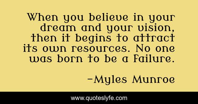 This page presents the quote "When you believe in your dream and your vision, then it begins to attract its own resources. No one was born to be a failure.". Author of this quote is Myles Munroe. This quote is about believe, dream, vision,.