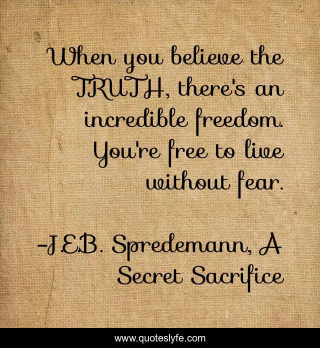 This page presents the quote "When you believe the TRUTH, there's an incredible freedom. You're free to live without fear.". Author of this quote is J.E.B. Spredemann, A Secret Sacrifice. This quote is about faith, bible, belief, freedom, truth, god-s-word, fear,.