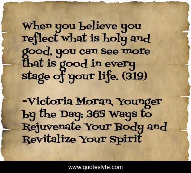 This page presents the quote "When you believe you reflect what is holy and good, you can see more that is good in every stage of your life. (319)". Author of this quote is Victoria Moran, Younger by the Day: 365 Ways to Rejuvenate Your Body and Revitalize Your Spirit. This quote is about life, good, self-awareness, holy, holiness, acceptance, life-s-stages, goodness,.