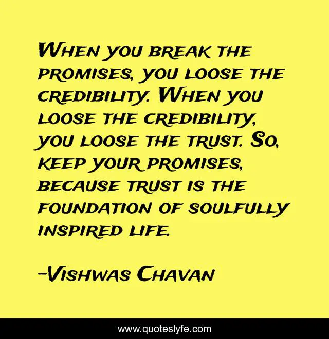 This page presents the quote "When you break the promises, you loose the credibility. When you loose the credibility, you loose the trust. So, keep your promises, because trust is the foundation of soulfully inspired life.". Author of this quote is Vishwas Chavan. This quote is about success, credibility, vishwasutras, trustworthy, trust, inspiration,.