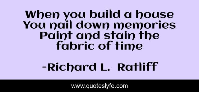 This page presents the quote "When you build a house You nail down memories Paint and stain the fabric of time". Author of this quote is Richard L. Ratliff. This quote is about wise-words, wise, house, time, wisdom, paint, build, memories, home,.