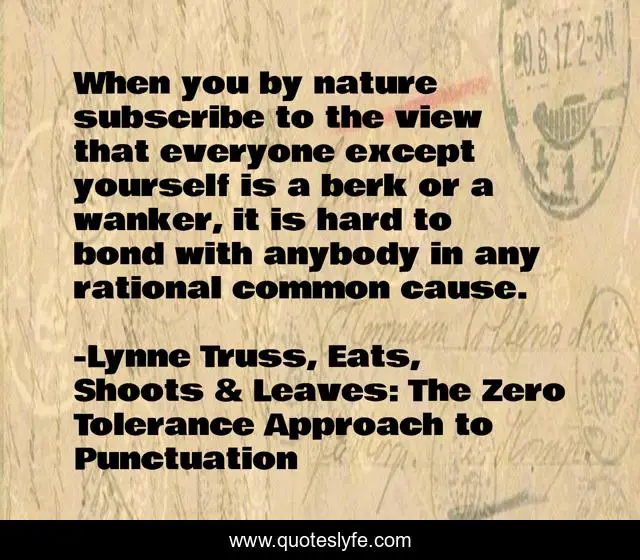 This page presents the quote "When you by nature subscribe to the view that everyone except yourself is a berk or a wanker, it is hard to bond with anybody in any rational common cause.". Author of this quote is Lynne Truss, Eats, Shoots & Leaves: The Zero Tolerance Approach to Punctuation. .