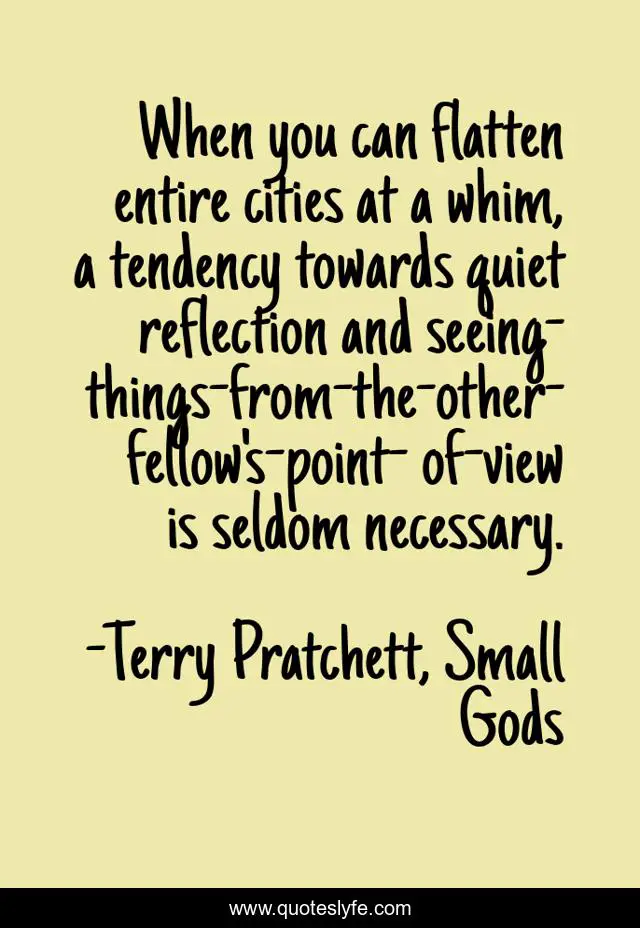 This page presents the quote "When you can flatten entire cities at a whim, a tendency towards quiet reflection and seeing-things-from-the-other-fellow's-point- of-view is seldom necessary.". Author of this quote is Terry Pratchett, Small Gods. .