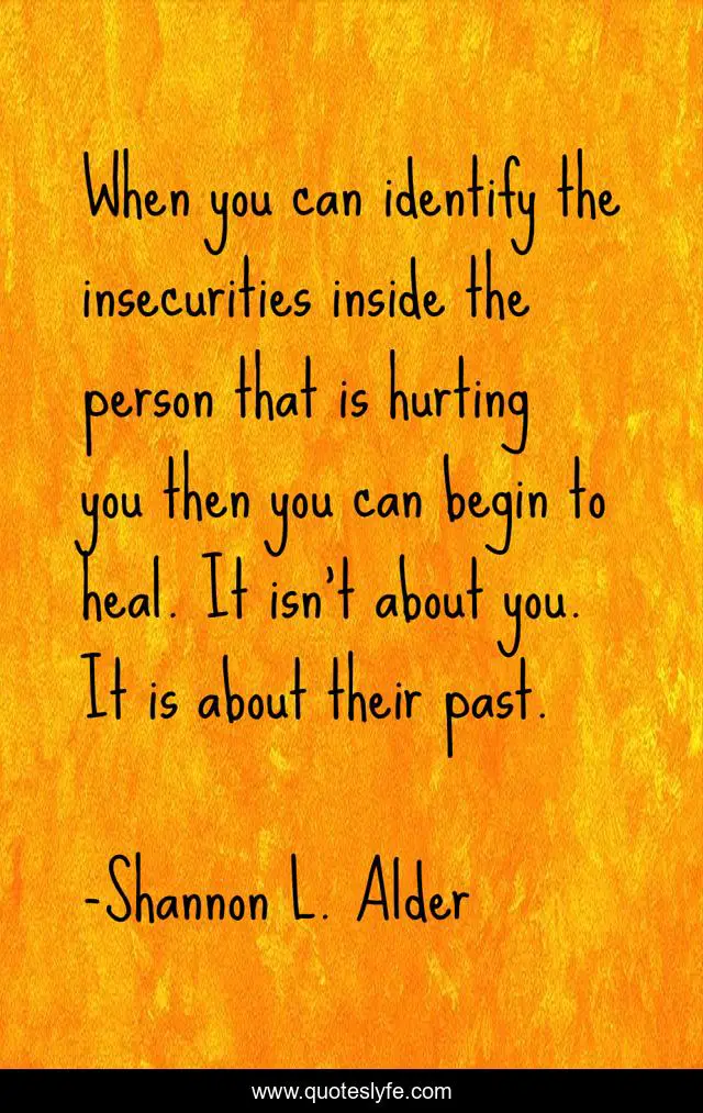 This page presents the quote "When you can identify the insecurities inside the person that is hurting you then you can begin to heal. It isn't about you. It is about their past.". Author of this quote is Shannon L. Alder. This quote is about narcissism, empathy, abusers, compassion, get-it, understanding, childhood-trauma,.