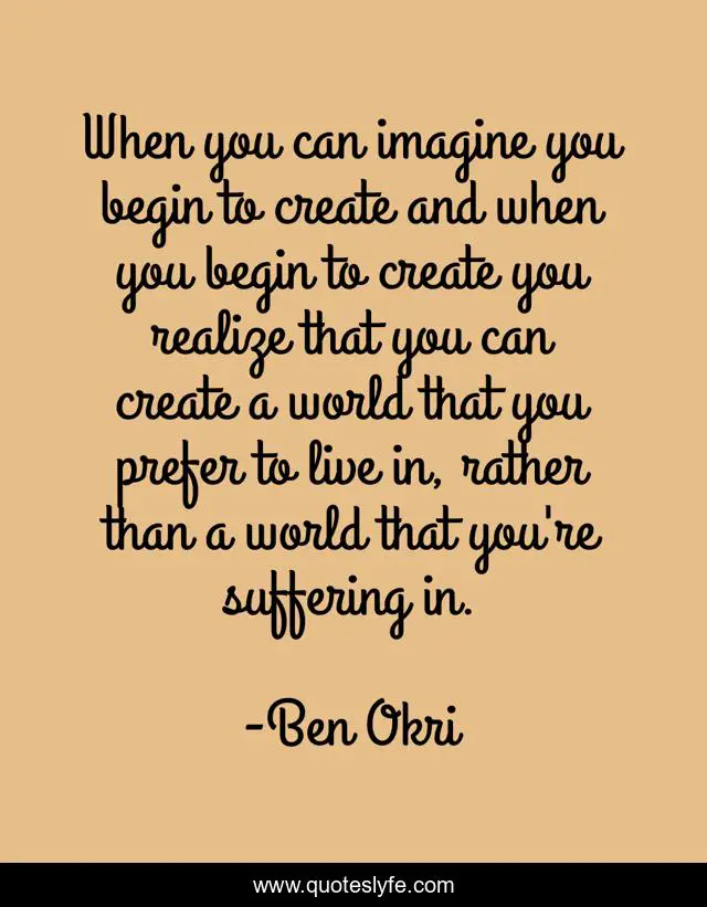 This page presents the quote "When you can imagine you begin to create and when you begin to create you realize that you can create a world that you prefer to live in, rather than a world that you're suffering in.". Author of this quote is Ben Okri. This quote is about world, suffering, live,.