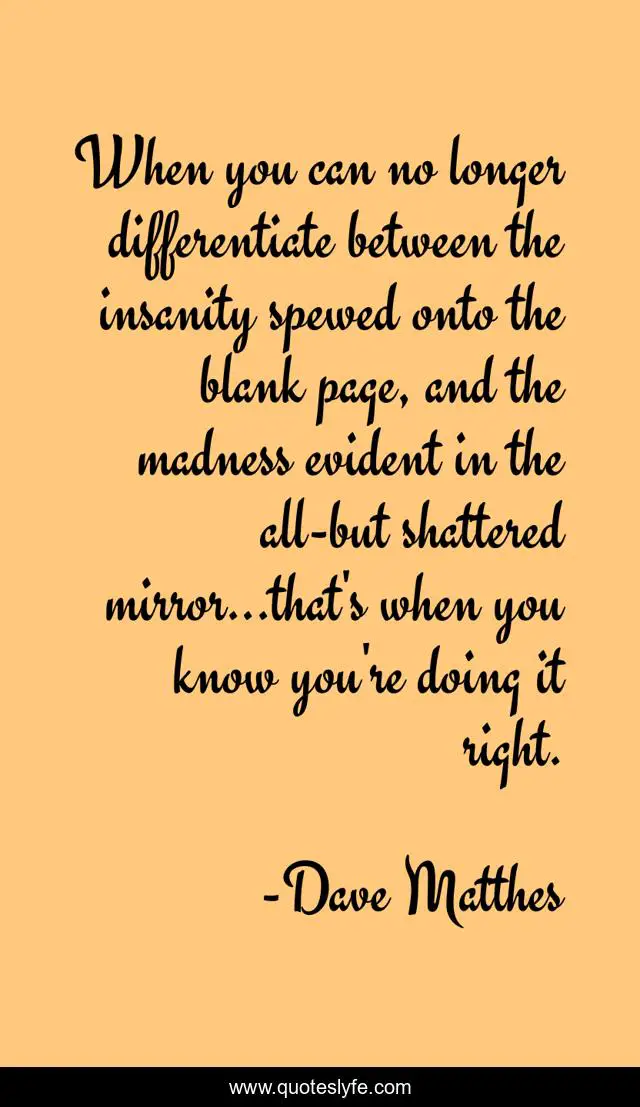 This page presents the quote "When you can no longer differentiate between the insanity spewed onto the blank page, and the madness evident in the all-but shattered mirror...that's when you know you're doing it right.". Author of this quote is Dave Matthes. This quote is about acceptance, reflection, truth,.