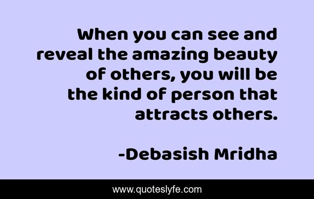 This page presents the quote "When you can see and reveal the amazing beauty of others, you will be the kind of person that attracts others.". Author of this quote is Debasish Mridha. This quote is about beauty, life-wisdom, amazing-beauty, philosophy, debasish-mridha, quotes, inspirational, enthusiasm, attract-others,.
