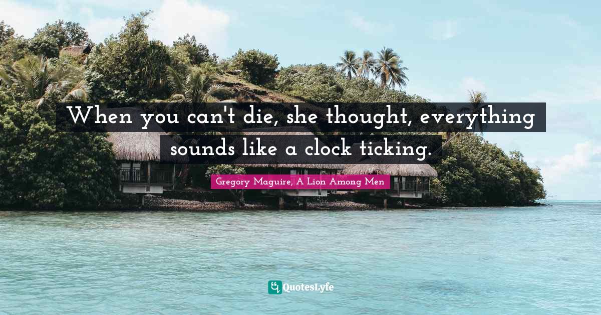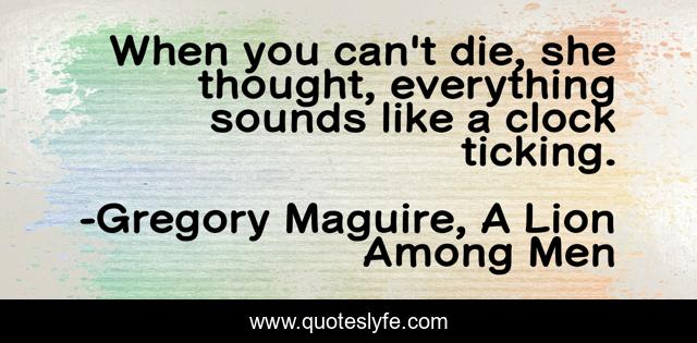 This page presents the quote "When you can't die, she thought, everything sounds like a clock ticking.". Author of this quote is Gregory Maguire, A Lion Among Men. .