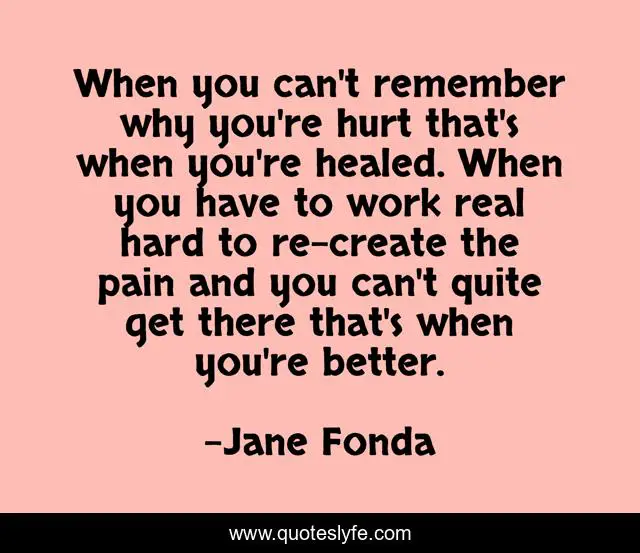 This page presents the quote "When you can't remember why you're hurt that's when you're healed. When you have to work real hard to re-create the pain and you can't quite get there that's when you're better.". Author of this quote is Jane Fonda. This quote is about victories, worthy,.